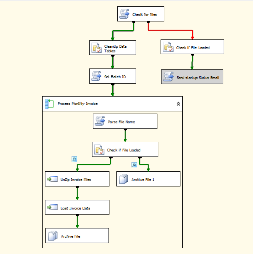 The query didn't work TSQL didn't like the DATEFROMPARS. I think see what you are going for there. That gives me an idea. This is probably not the easiest way but, if I took the last invoice date on the Invoice table and added one month. Say the date is 6/24/2017 add one month that makes it 7/24/2017. Then add 7 days to that and it return 7/31/2017. If todays date is greater than that date it is time to send the email. The nice thing is I could run the load every day it will never hit unless the invoice is 1 month and 7 days past due. The query below returns 8/31/2017 which is right because I have already loaded this months Invoice. Now the question is what is the best set up the branch in SSIS.