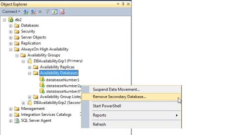 If the databaseNumber2 fails to move on DB2 (if i am not wrong the database appears in "Resolving" state) and if it happened that DB1 can't be restarted because of a hardware problem, I will have to connect on DB2 => Availaibility Groups = > Availability Databases => Right click on databaseNumber2 => click on Remove Secondary Database