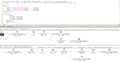 John Mitchell-245523 - Friday, September 29, 2017 5:35 AMYou pay your money, you take your choice. You could easily rewrite as follows - I don't think it would make any difference to performance either way....Field1 = CASE WHEN Field1 = '' THEN s.MaxField1 ELSE m.Field1 END...John