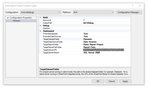I have successfully created my first SSRS project in Visual Studio. The deployment process requires setting up the TargetServerURL and the TargetServer Version. These are the only two items that I know are correct. The tutorial I have been watching does not go into the other items and does not clarify what they are and what they are used for. What are the following items referring to?