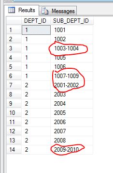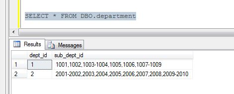 INSERT INTO DBO.department VALUES(1,'1001,1002,1003-1004,1005,1006,1007-1009') INSERT INTO DBO.department VALUES(2,'2001-2002,2003,2004,2005,2006,2007,2008, 2009-2010')