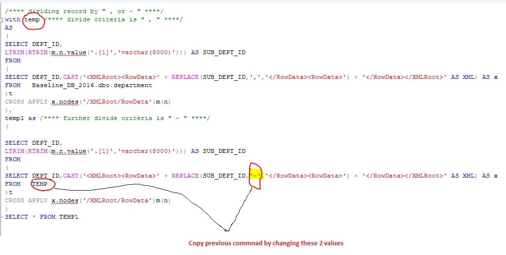In above mentioned code you can see we used same script by changing divident criteria from " , " to " - ", and FROM clause from actual table name to "Already fetched data" which is TEMP.