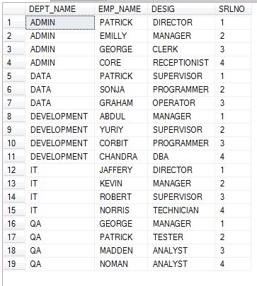 SELECT DEPT_NAME, EMP_NAME, DESIG, ROW_NUMBER() OVER (PARTITION BY DEPT_NAME ORDER BY CASE DESIG WHEN 'DIRECTOR' THEN 1 WHEN 'MANAGER' THEN 2 WHEN 'SUPERVISOR' THEN 3 ELSE 4 END ) AS SRLNO FROM DEPT_DESIG