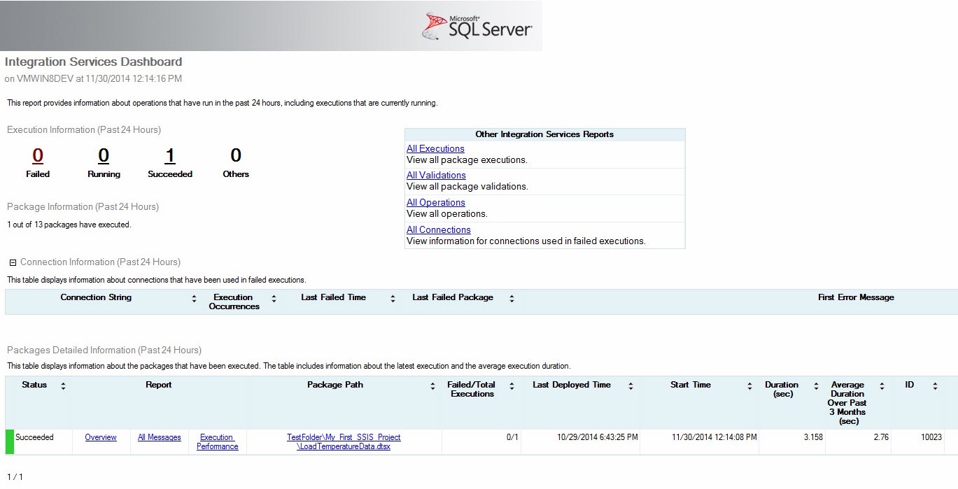 The report displays a really nice summary of the SSIS packages executed in the past 24 hours and appears similar to that shown in Figure 15: