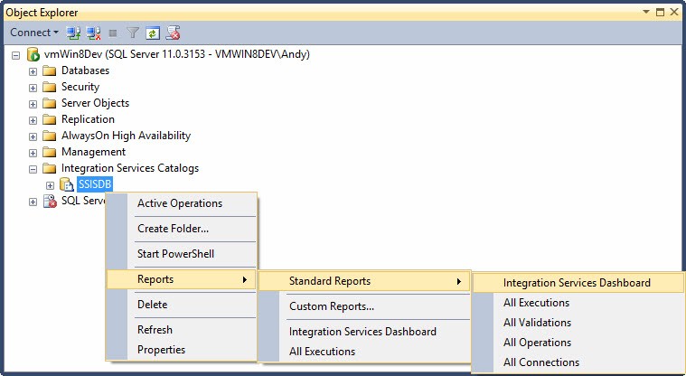 My chief complaint about this report is that, although it is written in SQL Server Reporting Services (SSRS), it is hard-coded into SQL Server Management Studio (SSMS). I would really like to allow more people access to this report, but I don’t necessarily want those people to have access to SSMS’s functionality. This is another complaint I have about the current implementation of the SSIS Catalog.
