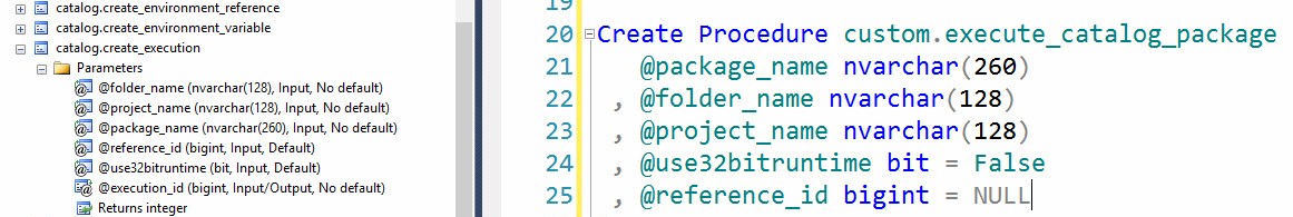 Once deployed, I can test the custom.execute_catalog_package stored procedure by executing the following Transact-SQL statement in SSMS: