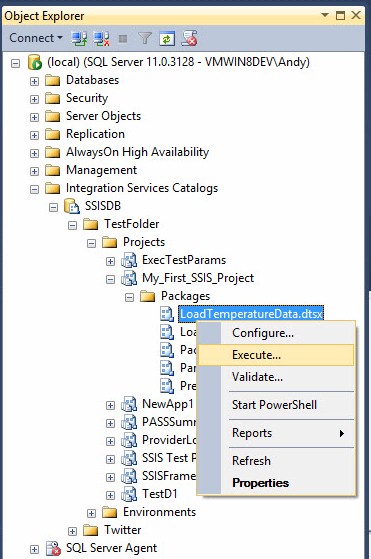 As discussed in Deployment and Execution – Step 18 of the Stairway to Integration Services, You can execute an SSIS package in the Catalog by drilling into the SSIS Catalog hierarchy to the Package level, right-clicking the SSIS package you wish to execute, and clicking “Execute…”, as shown in Figure 4: