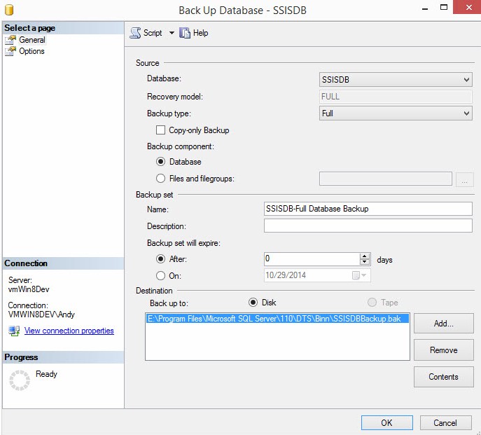Before I make a decision, I back up the SSISDB database. I highly recommend that you also back up your development version of the database, as shown in Figure 8: