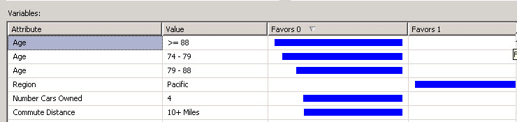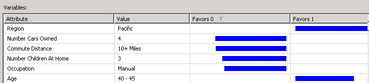 - You will find that the customers older than 88 years old would not buy a bike (Favors 0). This is because they are too old to ride a bike. The same for people from 74-79 years old or 79-88. On the other hand people from Pacific will likely buy a bike, and they are potential customers (Favors 1). If the customer has 4 cars, he may not buy a bike.