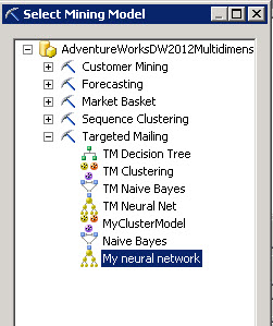 - In that project we already added views, inputs to the Data Mining Project, now we are going to add the Neural Network algorithm. In the Mining Model tab, press the Create a related mining model icon.