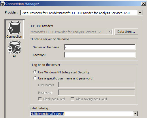 7. In the Provider Combobox Select the Provider for Analysis Services. In the Server or file name, specify the name of the server and in the Initial Catalog select the database with the Data Mining Model. In this case, we are using the database used in chapter 13.
