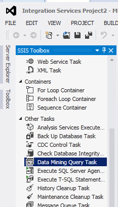 3. There are many tasks in SSIS to work with Web Services, create backups, execute queries, etc. In this lesson, we are going to use the Data Mining Query Task. Double click it.