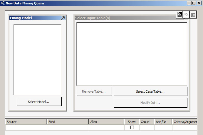 10. Here you can create your Data Mining Query visually. We are going to create a query here. Press the select model button.