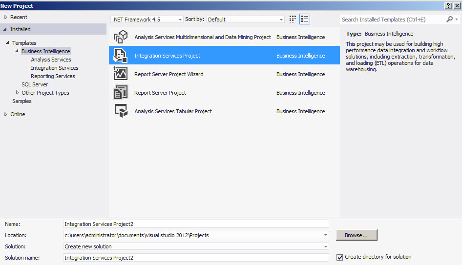 2. In the Menu, go to File>New Project and choose Integration Services Project. Specify the Name and Path.