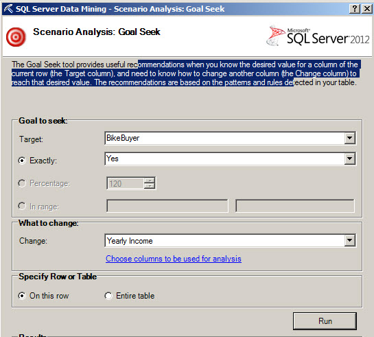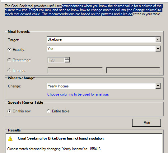 3. In this Example we are going to analyze the Yearly Income necessary to be a BikeBuyer(BikeBuyer=yes). For this purpose, select the BikeBuyer as a Target and the Value should be Exactly Yes. The value to change will be the Yearly Income and we are going to analyze only the selected row on step 1.
