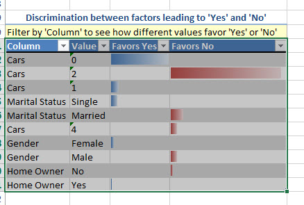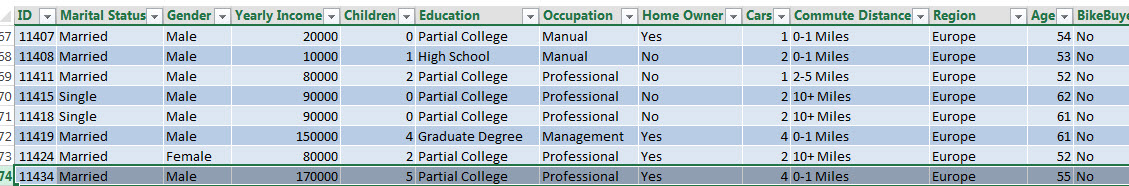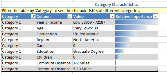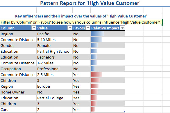 4. The Excel will show the columns than influence in the values to complete the information. Values like the Region from pacific, the Commute Distance of 5-10 miles influence in the values to determine if the customer is valuable or not.