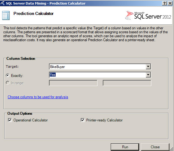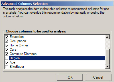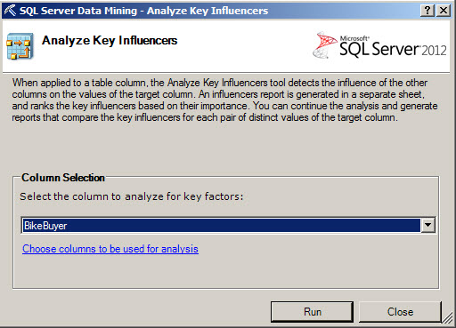 2. Select the BikeBuyer column as the column to analyze for key factors. The BikeBuyer shows if the customer will buy a bike or not and the Analyze Key Influencer will show which columns has influence.