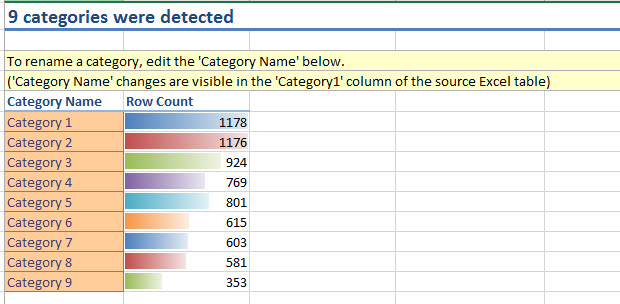 3. In these sample 9 categories were created and you can see the number of rows per category.