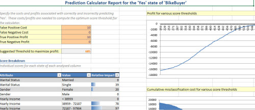 You also have the score breakdowns, which shows the impact in the BikeBuyer option. For example the marital status has no influence in the customer to be a bike buyer or not, while he Yearly Income is closely related.