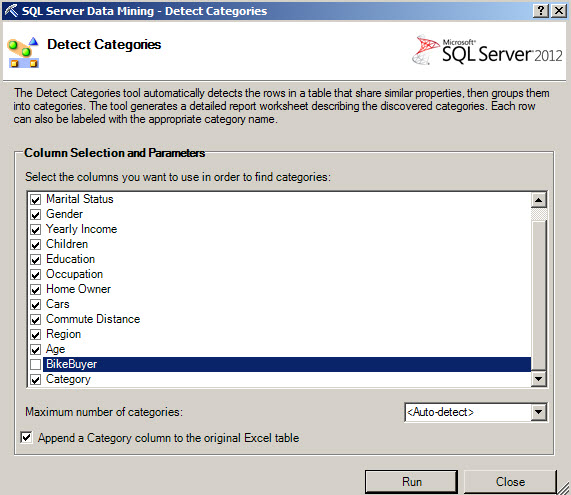 2. In the detect categories Window, select the columns that you want to categorize and press Run.