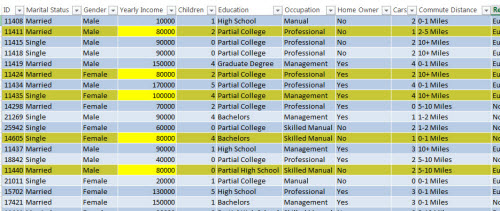 4. If you check the data analyzed, you will notice that some Yearly Incomes are now highlighted.