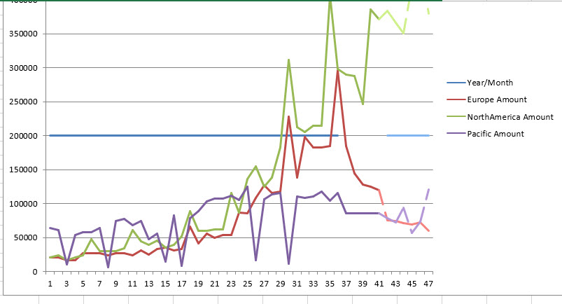 4. The reports shows the amount of money from Europe, North America and Pacific per month. The values dotted are the predicted values. According to the chart, the amount earned in Europe will go down and the amount earned in North America will increase over the time.