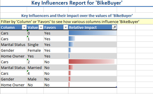 The first option is the Analyze Key Influencers. This option analyzes the columns to verify which ones influence on the results. In this sample we will analyze which columns influence in the customer to be a bike buyer or not.
