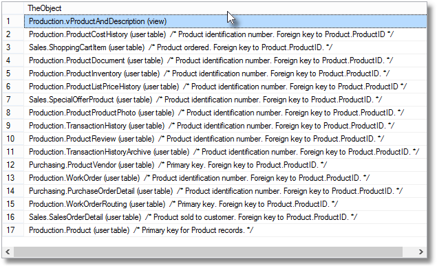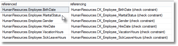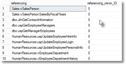 Tables can be referenced by other objects such as views and stored procedures. The following code shows us what objects reference the table HumanResources.employee in AdventureWorks2012. (All our examples were tested on this database).