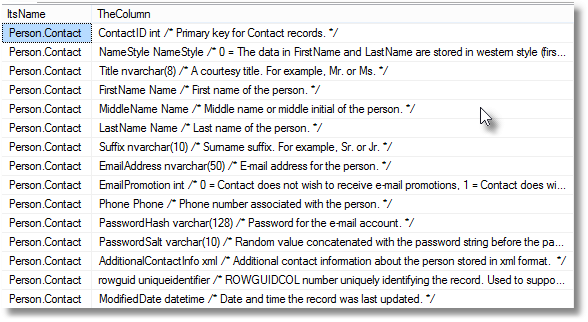 For example, if you want to quickly find out about the columns of the person.contact table, (or person.person in later versions of AdventureWorks) you can run this statement, to get a quick summary.