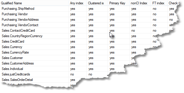 SELECT Object_Schema_name(t.object_ID)+'.'+t.name AS [Qualified Name], --questions about indexes CASE WHEN OBJECTPROPERTYEX(object_id,'TableHasIndex') = 0 THEN 'no' ELSE 'yes' END AS [Any index],--Table has an index of any type. CASE WHEN OBJECTPROPERTYEX(object_id,'TableHasClustIndex') = 0 THEN 'no' ELSE 'yes' END AS [Clustered Index],--Table has a clustered index. CASE WHEN OBJECTPROPERTYEX(object_id,'TableHasPrimaryKey') = 0 THEN 'no' ELSE 'yes' END AS [Primary Key],--Table has a primary key CASE WHEN OBJECTPROPERTYEX(object_id,'TableHasNonclustIndex') = 0 THEN 'no' ELSE 'yes' END AS [nonCl Index],--Table has a nonclustered index. CASE WHEN OBJECTPROPERTYEX(object_id,'TableHasActiveFulltextIndex') = 0 THEN 'no' ELSE 'yes' END AS [FT index],--Table has an active full-text index. --questions about constraints CASE WHEN OBJECTPROPERTYEX(object_id,'TableHasCheckCnst') = 0 THEN 'no' ELSE 'yes' END AS [Check Cnst],--Table has a CHECK constraint. CASE WHEN OBJECTPROPERTYEX(object_id,'TableHasUniqueCnst') = 0 THEN 'no' ELSE 'yes' END AS [Unique Cnst],--Table has a UNIQUE constraint. CASE WHEN OBJECTPROPERTYEX(object_id,'TableHasDefaultCnst') = 0 THEN 'no' ELSE 'yes' END AS [Default Cnst],--Table has a DEFAULT constraint. CASE WHEN OBJECTPROPERTYEX(object_id,'TableHasForeignKey') = 0 THEN 'no' ELSE 'yes' END AS [FK Cnst],--Table has a FOREIGN KEY constraint. CASE WHEN OBJECTPROPERTYEX(object_id,'TableHasForeignRef') = 0 THEN 'no' ELSE 'yes' END AS [FK Ref],--Table is referenced by a FOREIGN KEY constraint. --questions about triggers CASE WHEN OBJECTPROPERTYEX(object_id,'TableHasInsertTrigger') = 0 THEN 'no' ELSE 'yes' END AS [Insert Tgr],--Object has an INSERT trigger. CASE WHEN OBJECTPROPERTYEX(object_id,'TableHasUpdateTrigger') = 0 THEN 'no' ELSE 'yes' END AS [Update Tgr],--Table has an UPDATE trigger. CASE WHEN OBJECTPROPERTYEX(object_id,'TableHasDeleteTrigger') = 0 THEN 'no' ELSE 'yes' END AS [Delete Tgr],--Table has a DELETE trigger. --questions about types of columns CASE WHEN OBJECTPROPERTYEX(object_id,'TableHasIdentity') = 0 THEN 'no' ELSE 'yes' END AS [Identity Col],--Table has an identity column. CASE WHEN OBJECTPROPERTYEX(object_id,'TableHasRowGuidCol') = 0 THEN 'no' ELSE 'yes' END AS [ROWGUIDCOL],--has a ROWGUIDCOL for a uniqueidentifier col. CASE WHEN OBJECTPROPERTYEX(object_id,'TableHasTextImage') = 0 THEN 'no' ELSE 'yes' END AS [Has Lob],--Table has a text, ntext, or image column. CASE WHEN OBJECTPROPERTYEX(object_id,'TableHasTimestamp') = 0 THEN 'no' ELSE 'yes' END AS [Timestamp]--Table has a timestamp column. FROM sys.tables t ORDER BY [Qualified Name]