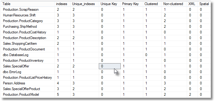 - indexes: whether it has an index of any type, a clustered index, a primary key, a nonclustered index, an active full-text index