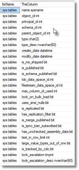 I’ve written this as a general column-lister for any table, view or table-valued function. If you need to see what is in sys.tables, for example, you can use the same query.