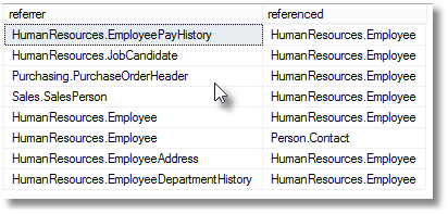 As you can see, tables can reference other tables, via a trigger in this case, but you’ll notice that these code references (called ‘soft’ references) are not the only type. There are these ‘soft’ dependencies; references to other objects in SQL code that are exposed by sys.sql_expression_dependencies, and ‘hard’ dependencies that are exposed by the object catalog views. ‘Hard’ dependencies are inherent in the structure of the database, whereas code can reference objects in another database on the same server or on another server. If foreign key constraints have been properly added to enforce the integrity of these references, we can determine this network of dependencies. If, for example we wanted to find out what tables HumanResources.employee references, and the tables that reference it, we would use this code…