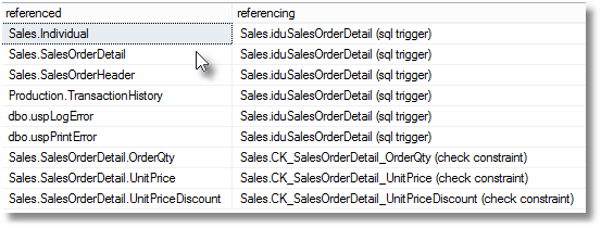 We are only looking at references in code here, including the code within check constraints, rather than those references defined by foreign key constraints. If we perform the same query but using a table with a complex trigger, such as ‘ales.SalesOrderDetail we can find some surprising dependencies.
