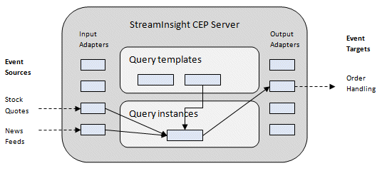 Binding a query template with specific input and output adapters together with configuration information results in a query instance in the CEP server. A Query Instance can be started, stopped and monitored through Diagnostic Views.