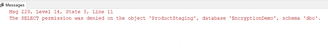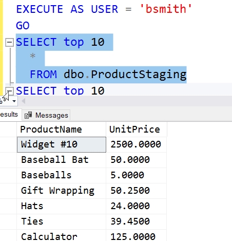 SELECT TOP 10 ProductName, UnitPrice INTO ProductStaging FROM dbo.OrderDetail GO EXECUTE AS USER = 'bsmith' GO SELECT top 10 * FROM dbo.ProductStaging