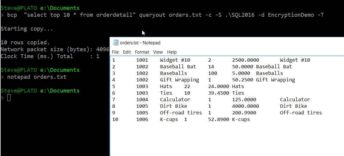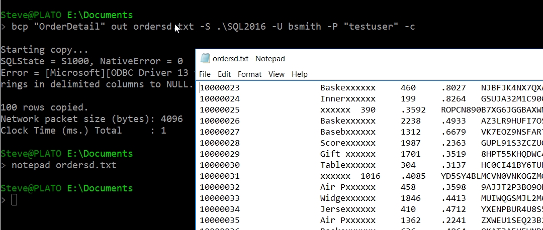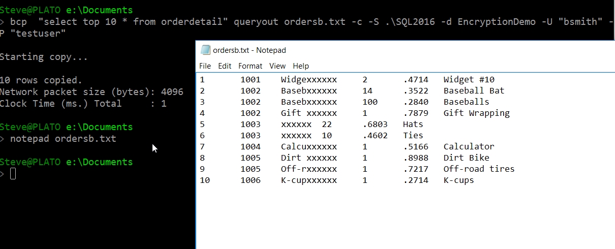One of the common ways to move data out of SQL Server, other than by query, is through bcp. Let's see how I'd do this as a privilged user. Since this user can see the raw data in the table, I don't expect any masking to be applied. This is exactly what we see.