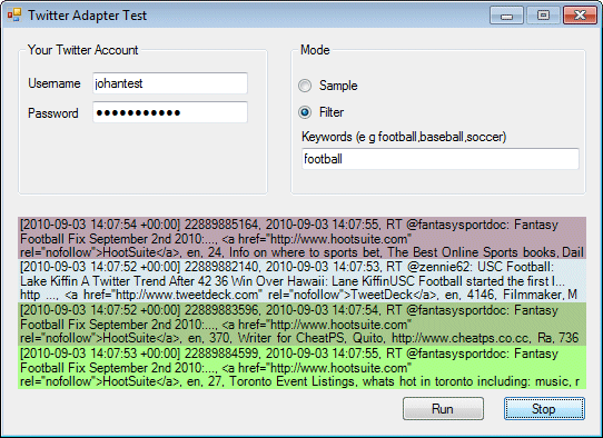 The input adapter then should establish a HTTP (or HTTPS) connection with the Twitter server, passing these parameters in the HTTP Request. That can be done using the standard .NET HttpWebRequest class. The Twitter streaming API will separate each event with a linefeed character, so you can call ReadLine on the response stream to get one event at a time. The basic structure of the code is: