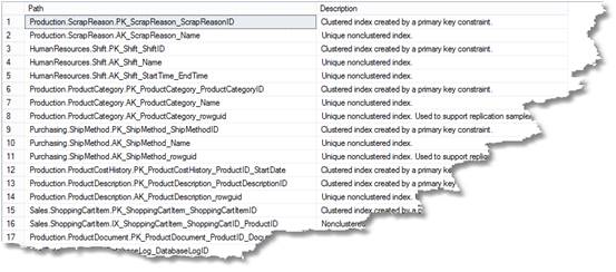 SELECT --indexes OBJECT_SCHEMA_NAME(ix.object_id)+'.'+OBJECT_NAME(ix.object_id)+'.'+ix.name AS Path, CONVERT(VARCHAR(100), COALESCE(ep.value, '')) AS Description --the extended property as string FROM sys.indexes ix LEFT OUTER JOIN sys.extended_properties ep ON ep.major_id=ix.OBJECT_ID AND class=7 AND ep.name = 'MS_Description' AND ep.minor_id=ix.index_id WHERE type <>0 --don't include heaps AND OBJECTPROPERTYEX(ix.object_id, 'IsMsShipped') = 0;