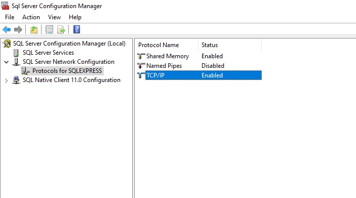 conn.Open();The command times out because the protocol to make the connection to SQL Server Express has not been enabled. So, this requires a change in SQL Server Configuration Manager. In the tree list on the left, open the SQL Server Network Configuration note and select the Protocols for your instance of SQL Server.