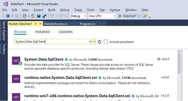 In the image above, the SqlClient item has a green arrow because I had already downloaded it when I took the screen shot. Click to download the package from NuGet.