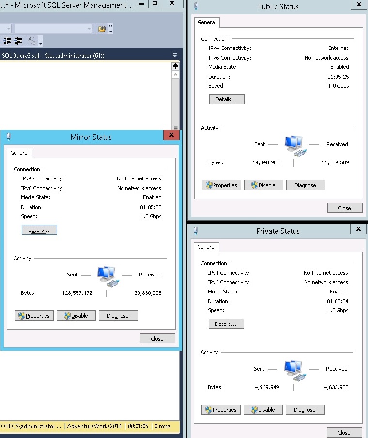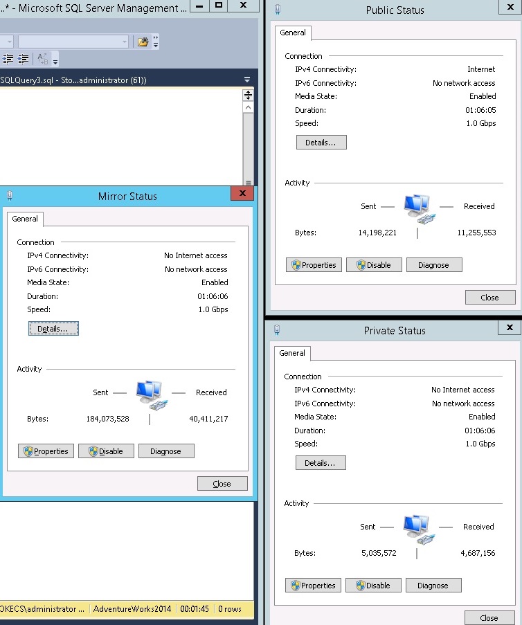 Moving on from the configuration, let's look at network statistics for our network connections. We want to see the mirror network actively sending bytes of data on the Primary. Testing a large table creation produces the following traffic statistics across the networks on the Primary.