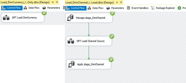 When the Biml expands, we see two SSIS Packages generated from metadata: Load DimChannel.dtsx and Load DimCurrency.dtsx as show in Figure 6: