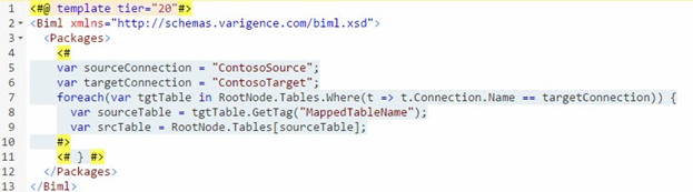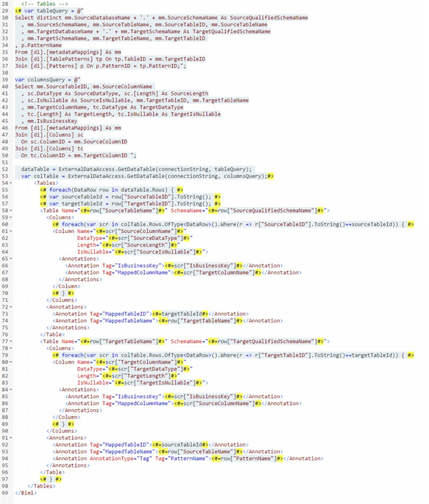 Beginning with the Tables BimlScript that starts at line 28, we modify the BimlScript as shown (new and updated BimlScript is highlighted):