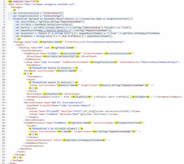 Open the CreatePackages.biml file. For our purposes, we are going to define the design pattern portion of the Biml in CreatePackages.biml as the portion contained within the Package open and closing tags. These are lines 10-54 in Figure 1. In order to create a new architecture where our patterns are isolated so that we can easily choose among, we need to move these lines of code into a new Biml file. The following sections will walk you through the process of refactoring our code do so.