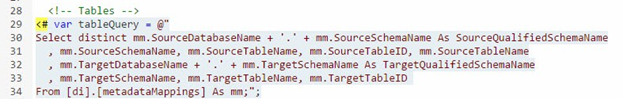 We will modify the LoadBimlRelationalHierarchy.biml file to retrieve the name of our pattern. It makes the most sense to modify the query for Table metadata, which begins on line 67 as shown in Figure 9: