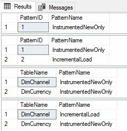 Let’s add IncrementalLoad metadata to our BRMetadata [di].[Patterns] and [di].[TablePatterns] tables. The Transact-SQL that follows adds IncrementalLoad to the list of SSIS design patterns in the [di].[Patterns] table, and then assigns the IncrementalLoad pattern to the DimChannel table loader: