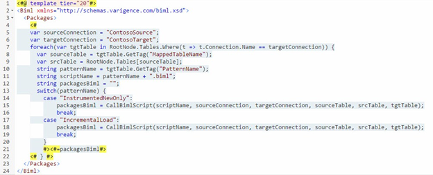 Select these lines of BimlScript code, and then cut them into the clipboard. Create a new Biml file named InstrumentedNewOnly.biml and paste the contents of the clipboard into this file, overwriting the opening and closing Biml tags. CreatePackages.biml will now appear as shown in Figure 2: