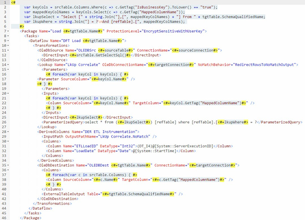 More specifically, CreatePackages.biml contains the design pattern for constructing the SSIS packages. The pattern builds a Data Flow Task that: