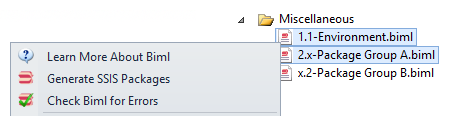 To make the above definition easier to understand, let’s look at an example with diagrams. The example includes two files: 1.1-Environment.biml and 2.x-Package Group A.biml.